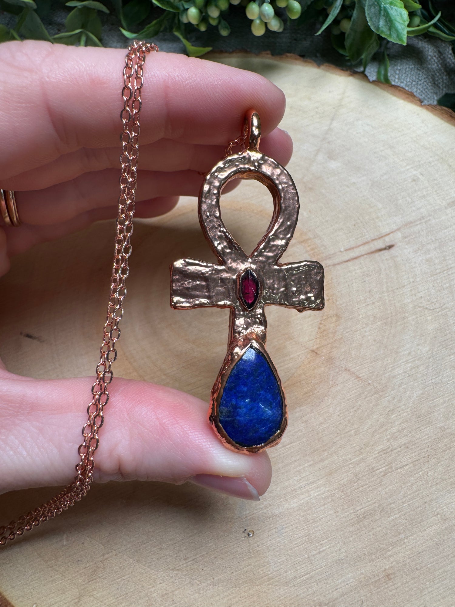 This necklace is made with copper. This pendant hangs on an 18" rose gold plated over brass chain necklace.