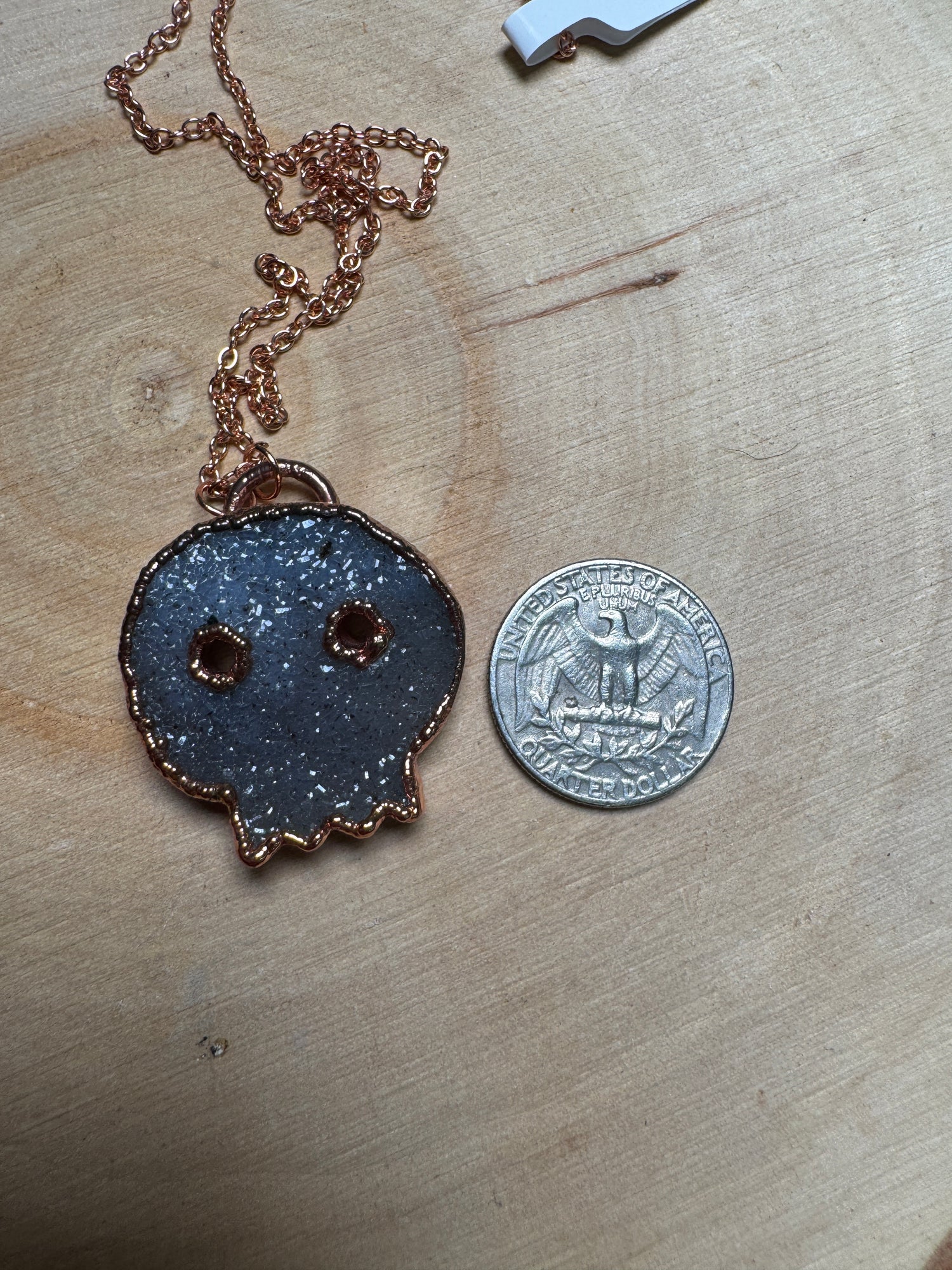This necklace is made with copper. This pendant hangs on an 18" rose gold plated over brass chain necklace.