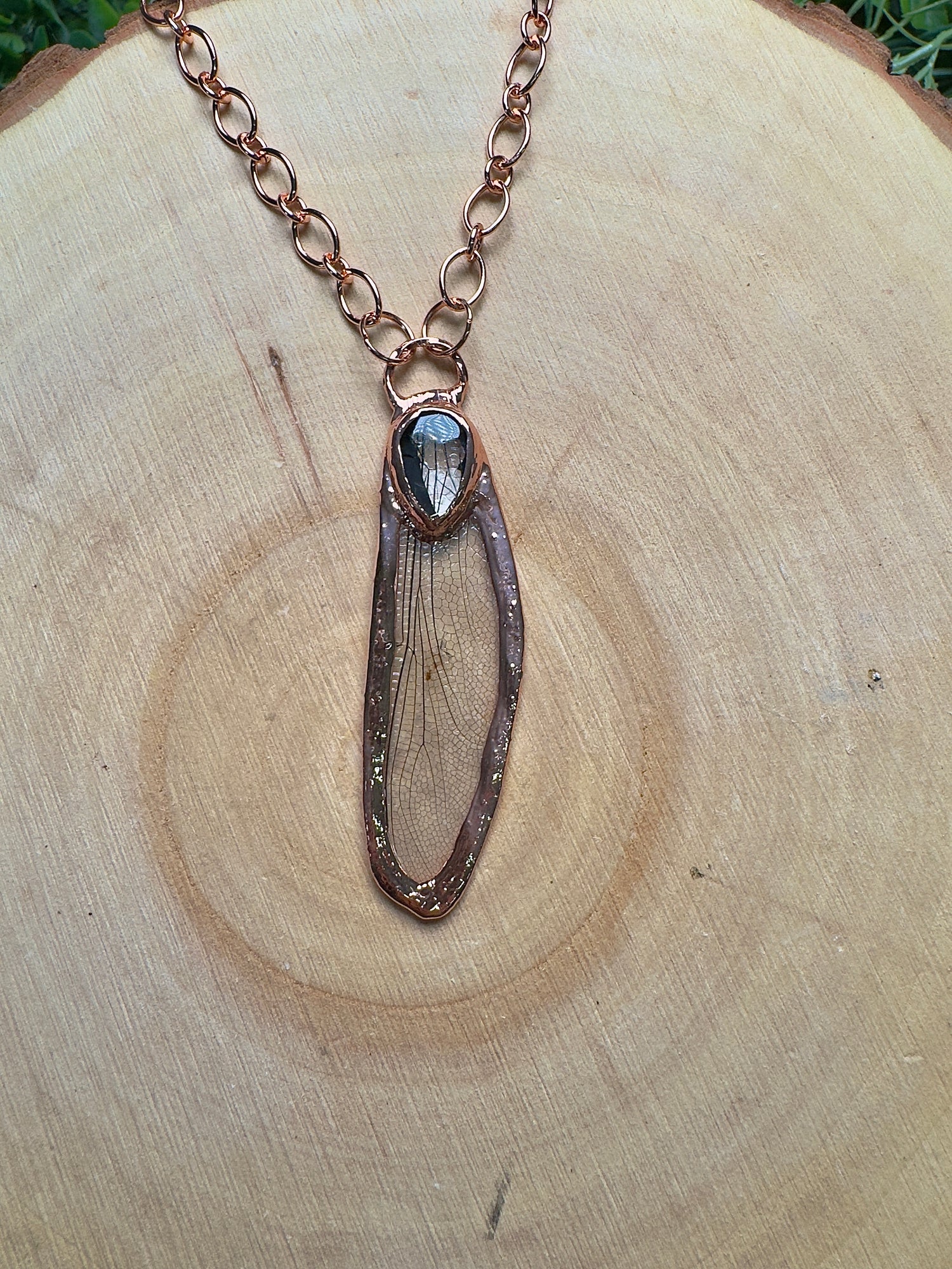 This necklace is made with copper, and a real, ethically sourced dragonfly wing. This pendant hangs on an 18" rose gold plated over brass chain necklace.