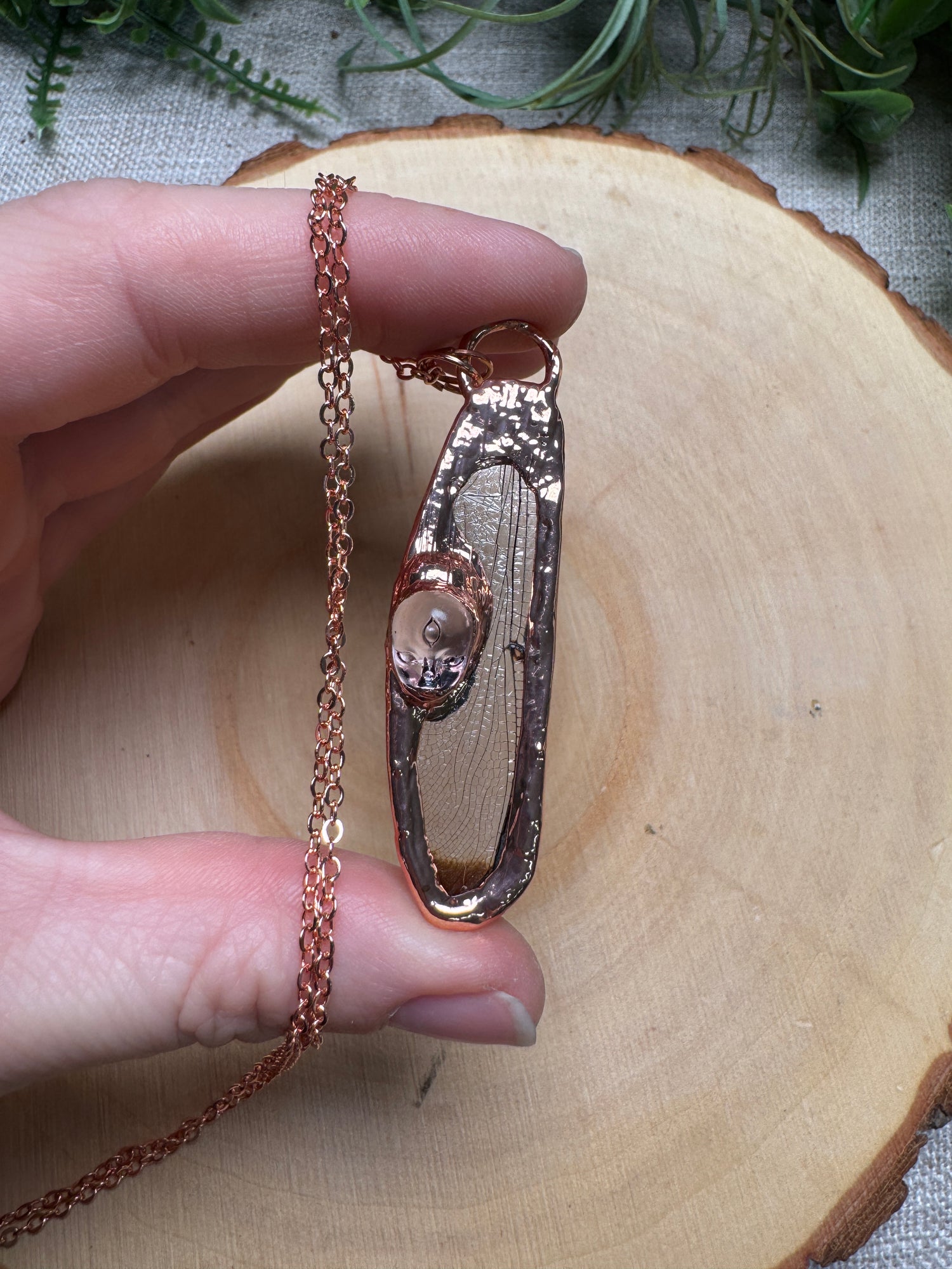 This necklace is made with copper, and a real, ethically sourced dragonfly wing. This pendant hangs on an 18" rose gold plated over brass chain necklace.