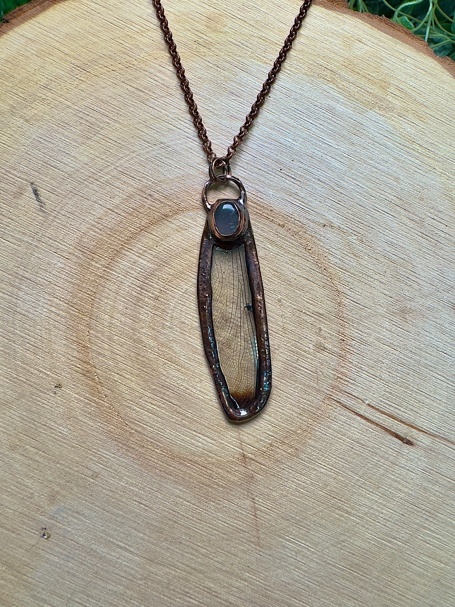 This necklace is made with copper, and a real, ethically sourced dragonfly wing. This pendant hangs on an 18" copper chain necklace.