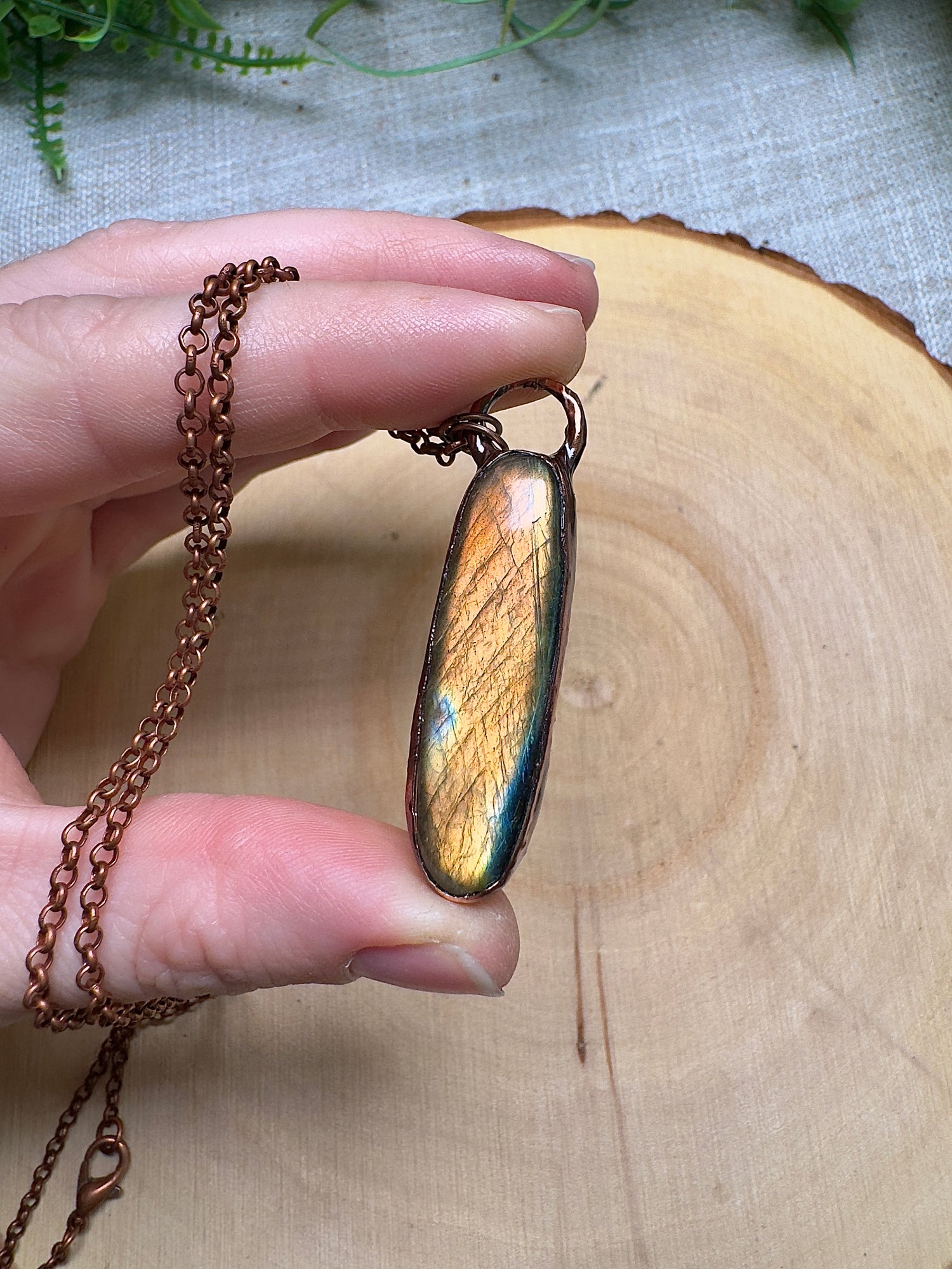 This necklace is made with copper. This pendant hangs on an 18" copper chain necklace.