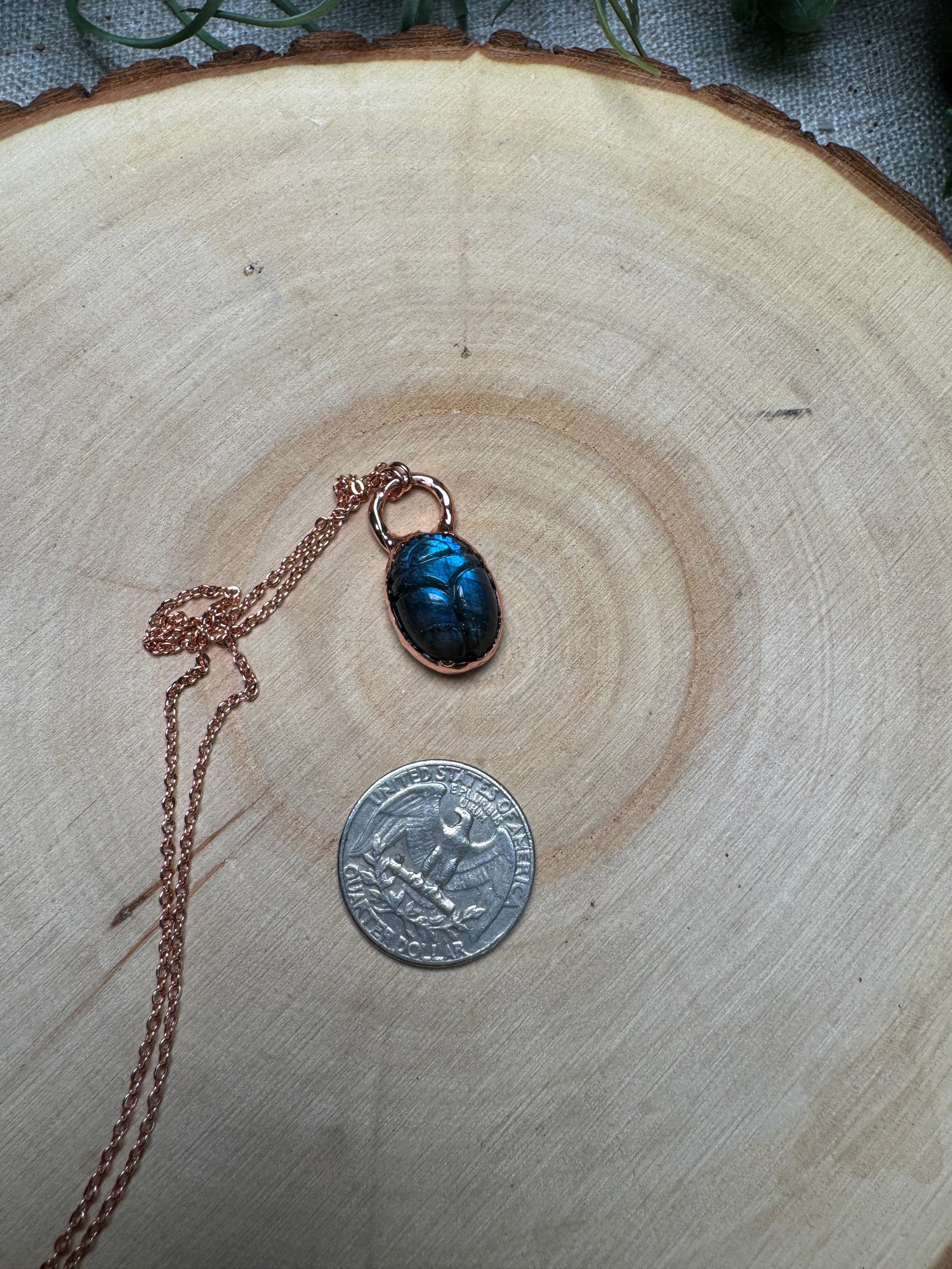 This necklace is made with copper. This pendant hangs on an 18" rose gold plated over brass chain necklace.
