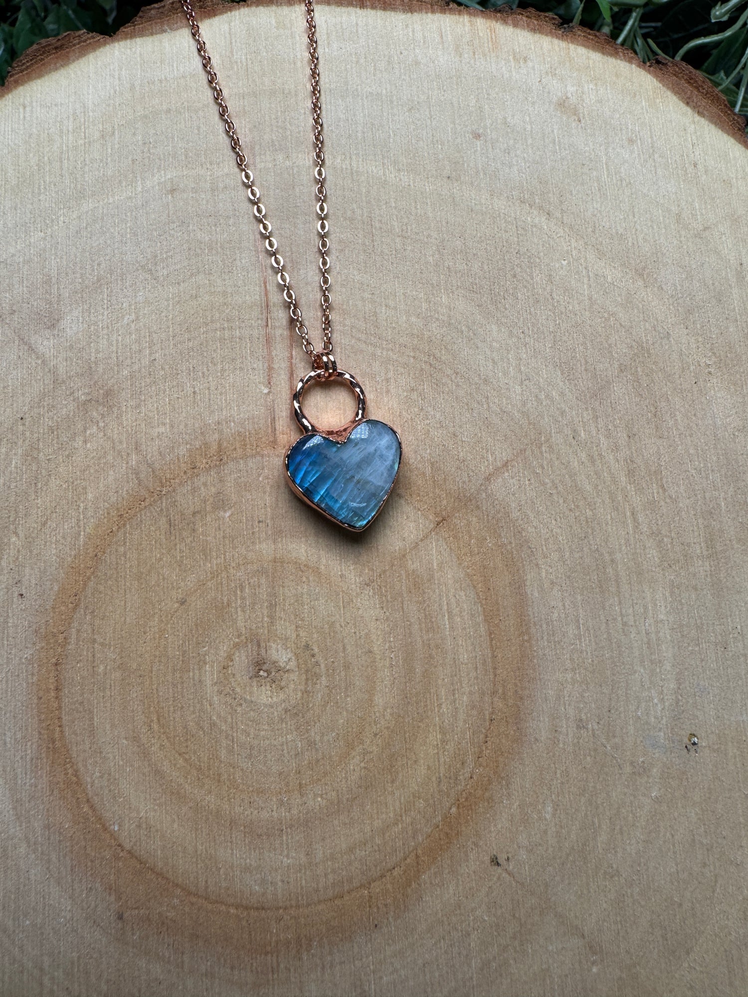 This necklace is made with copper. This pendant hangs on an 18" rose gold plated over brass chain necklace.